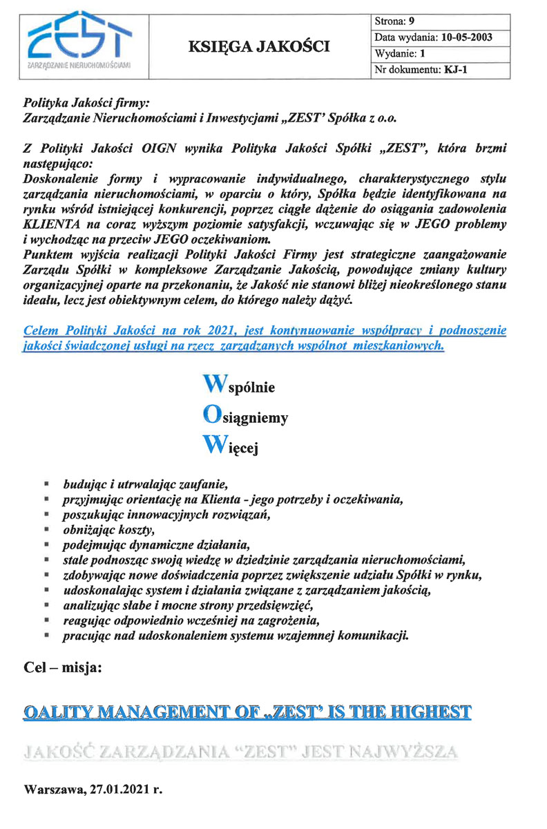 Z Polityki Jakości OIGN wynika Polityka Jakości Spółki „ZEST”, która brzmi następująco: